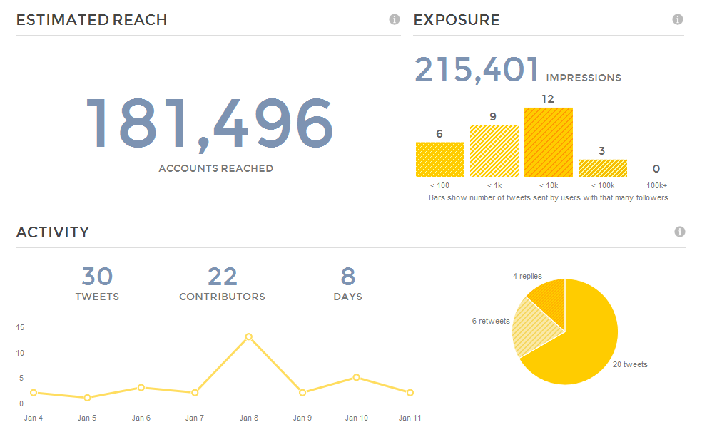 Como se pone de manifiesto en el gráfico, el término #Glamjan ha tenido una exposición de 215.401 impresiones (la cantidad de veces que un mismo tweet ha sido visto por los usuarios) en ese periodo, esto significa que éstas han sido las personas que ha alcanzado, apareciendo el término en su timeline –aunque sólo 181.496 impresiones únicas, es decir, sin contar las veces que el usuario ha visto el hashtag varias veces –). El día con más movimiento fue el 8 de enero, con 20 tweets. Tan sólo 15 cuentas de las que enviaron tweets tenían más de 10.000 seguidores (y de éstas tan sólo 3 más de 100.000).