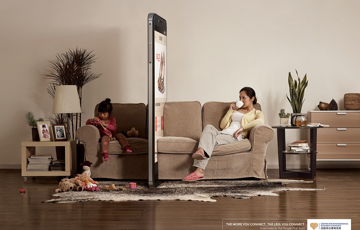 Precisamente esta campaña publicitaria de Shiyang He destaca los aspectos negativos del uso de los smartphones. La acción de comunicación se titula Phone Wall (Muro telefónico) y bajo el lema «The more you connect, the less you connect» (Cuanto más se conecta, menos se conecta).